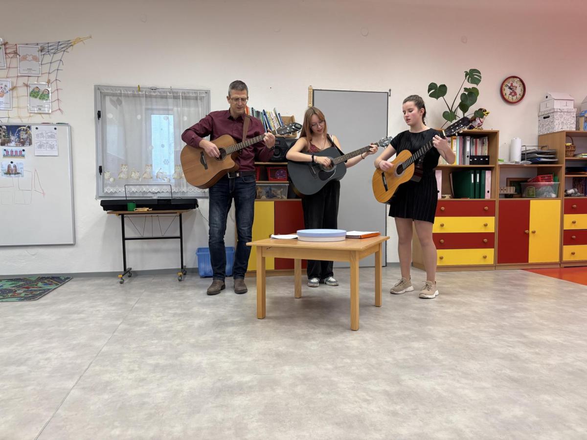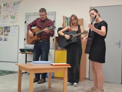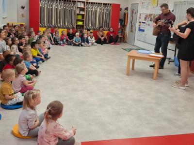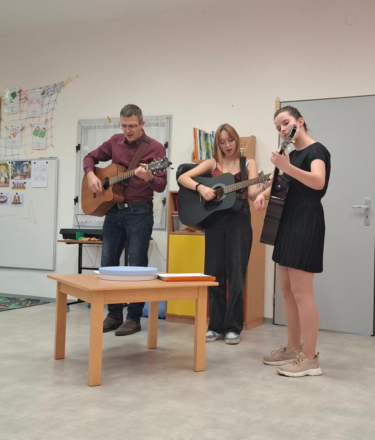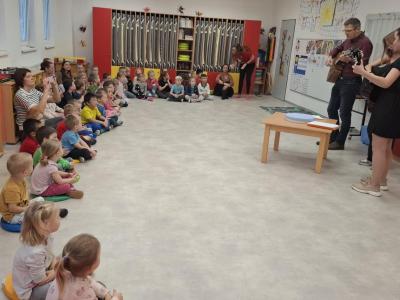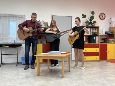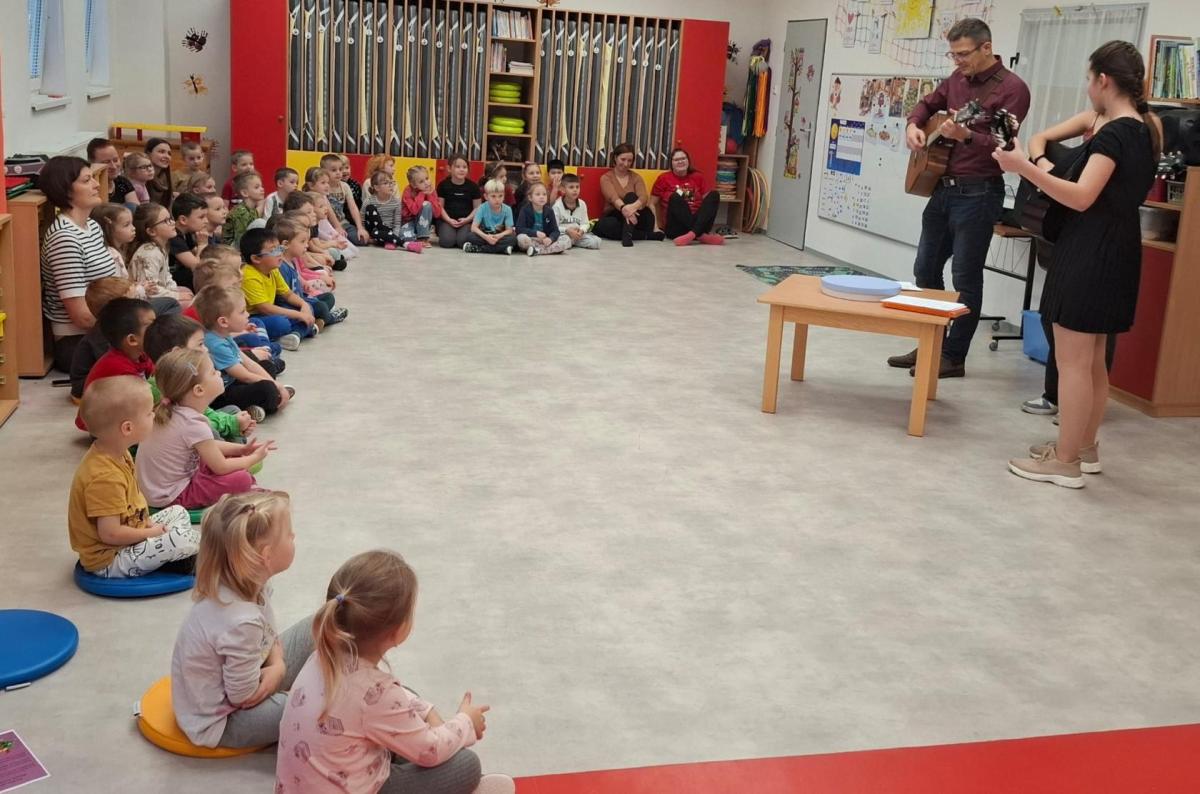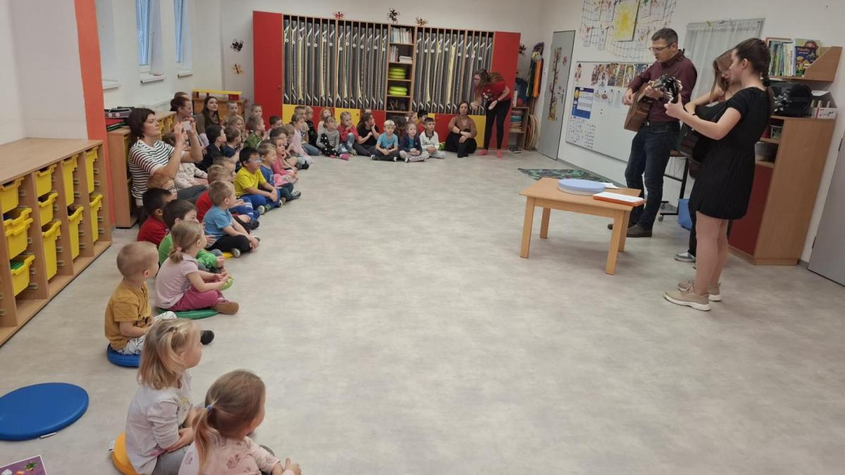 Pan ředitel se žákyněmi dětem zahráli na kytary a zazpívali známé vánoční písně. Do zpěvu se s velkou radostí zapojily také naše děti, které si známé koledy nadšeně zazpívaly společně s hosty. Celým prostorem se nesla příjemná, sváteční nálada plná dětského nadšení.