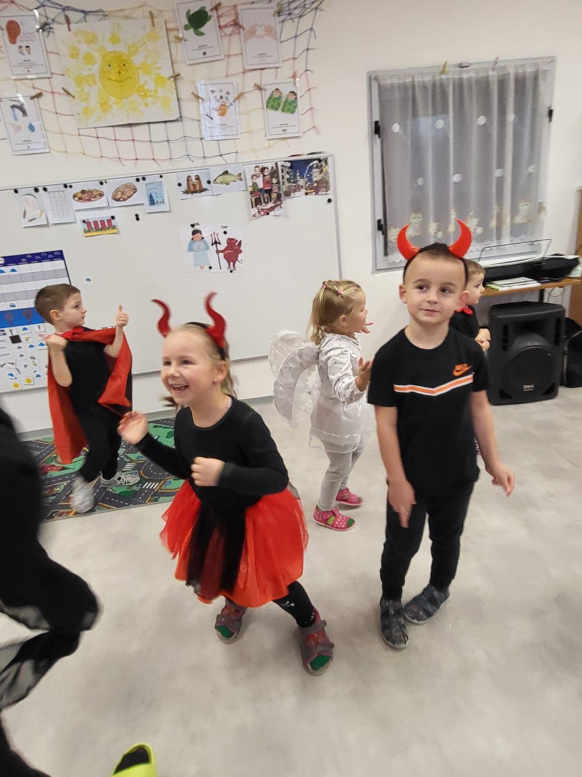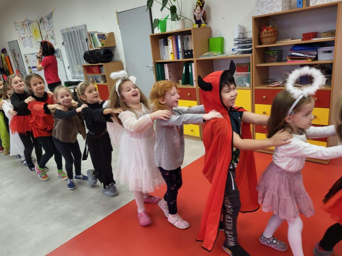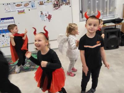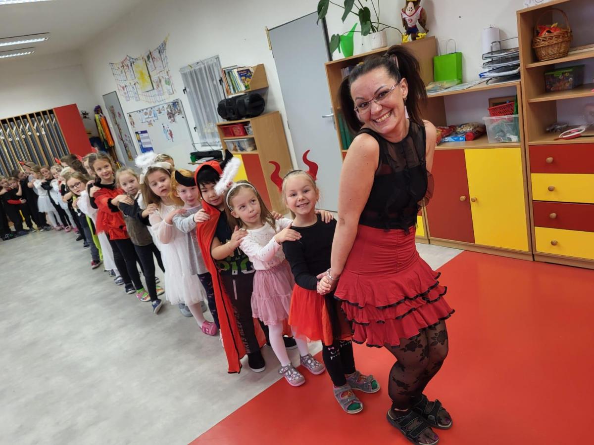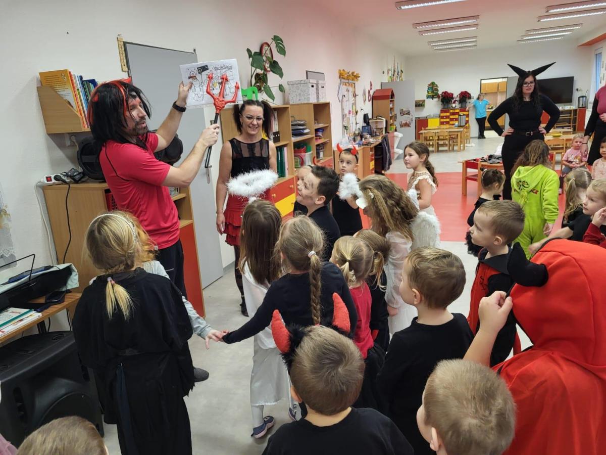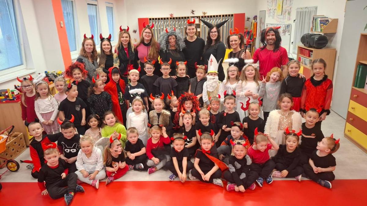 Hned ráno dorazily do školky děti v nádherných kostýmech čertíků, andělů i malých Mikulášů. Fantazii se meze nekladly – nechyběly rohy, ocásky, třpytivá křídla ani veselé masky. Sváteční atmosféru doplnily i naše paní učitelky a asistentky, které se také převlékly do kostýmů a spolu s dětmi vytvořily hravou a veselou pekelně-andělskou partu.
