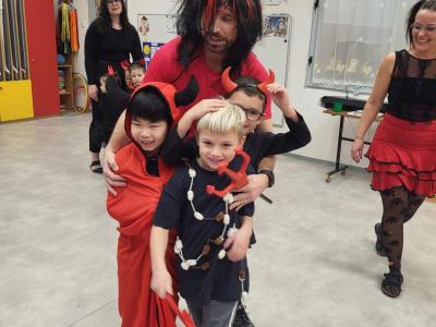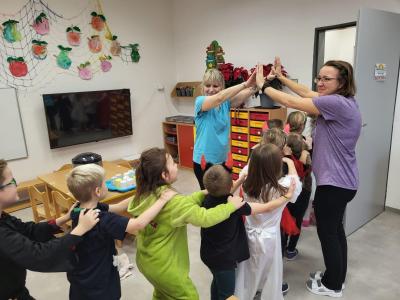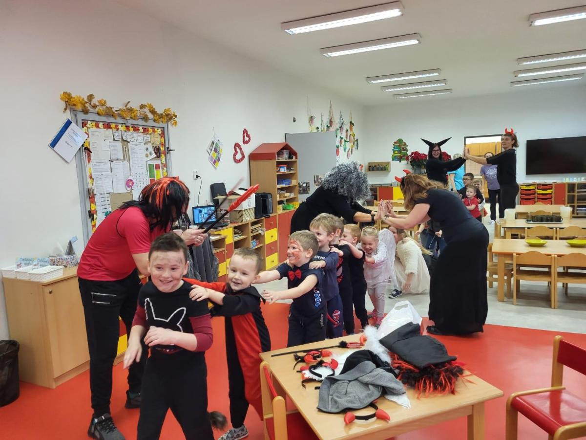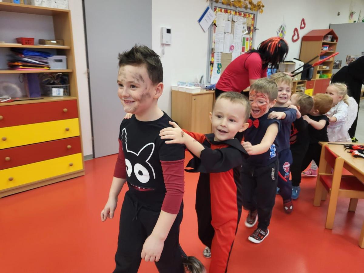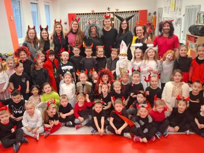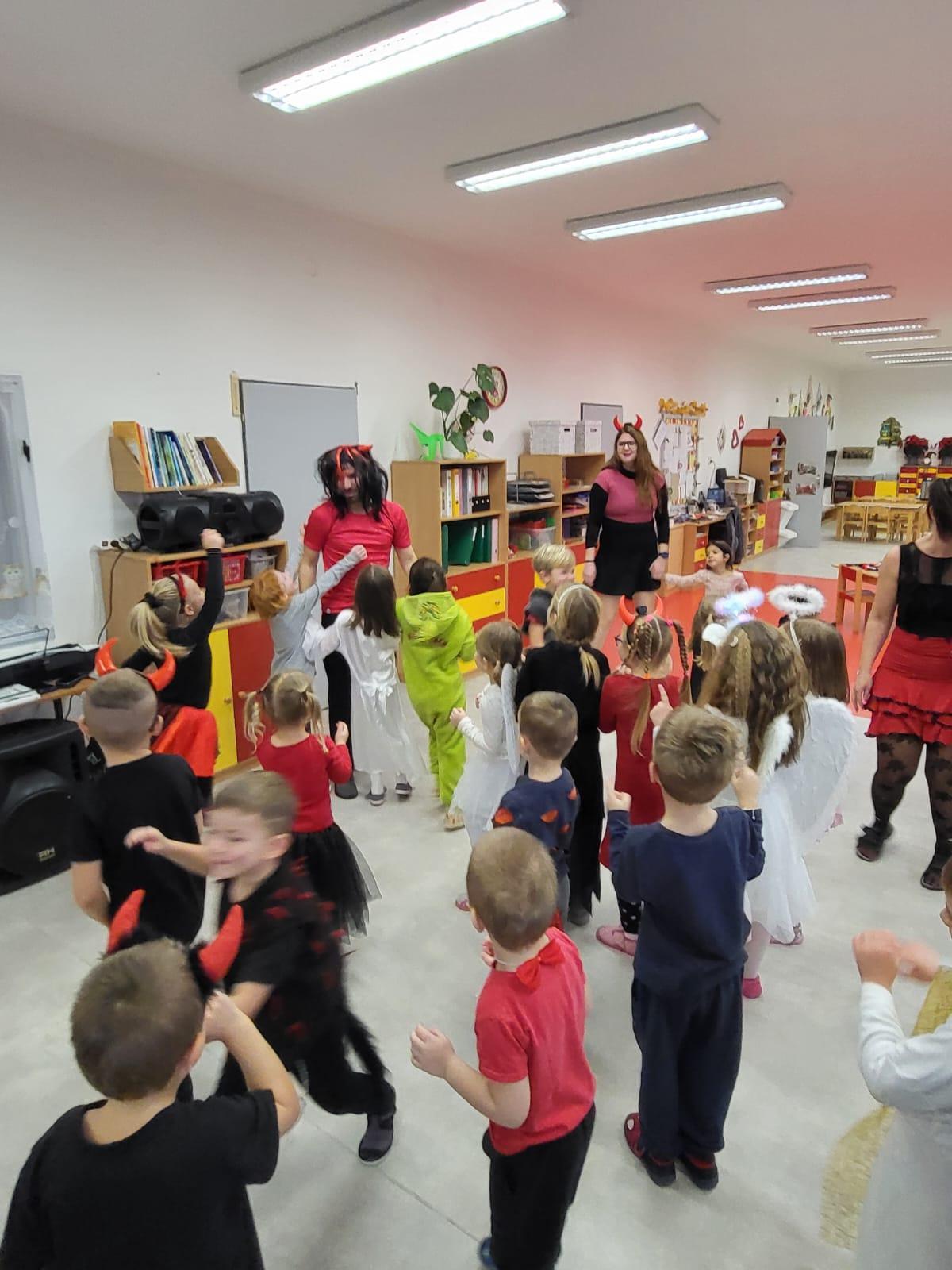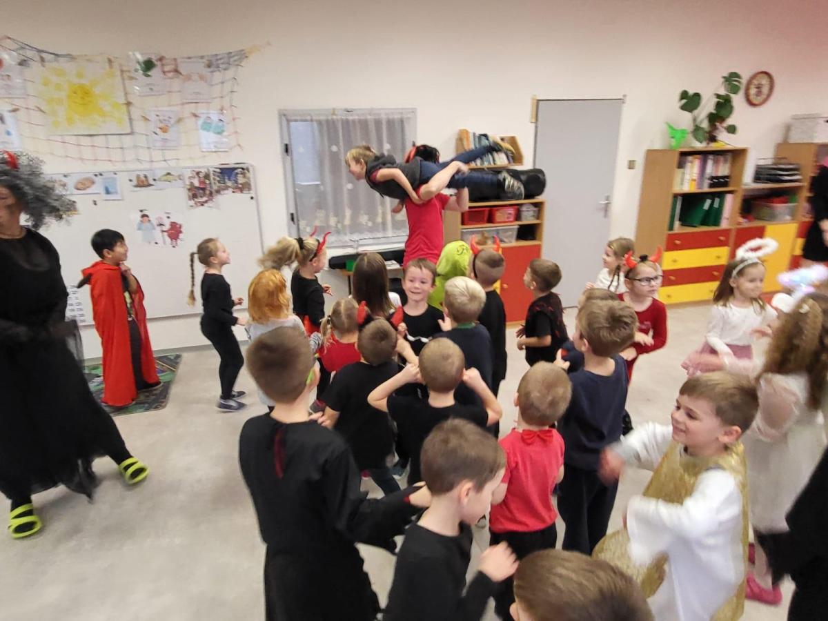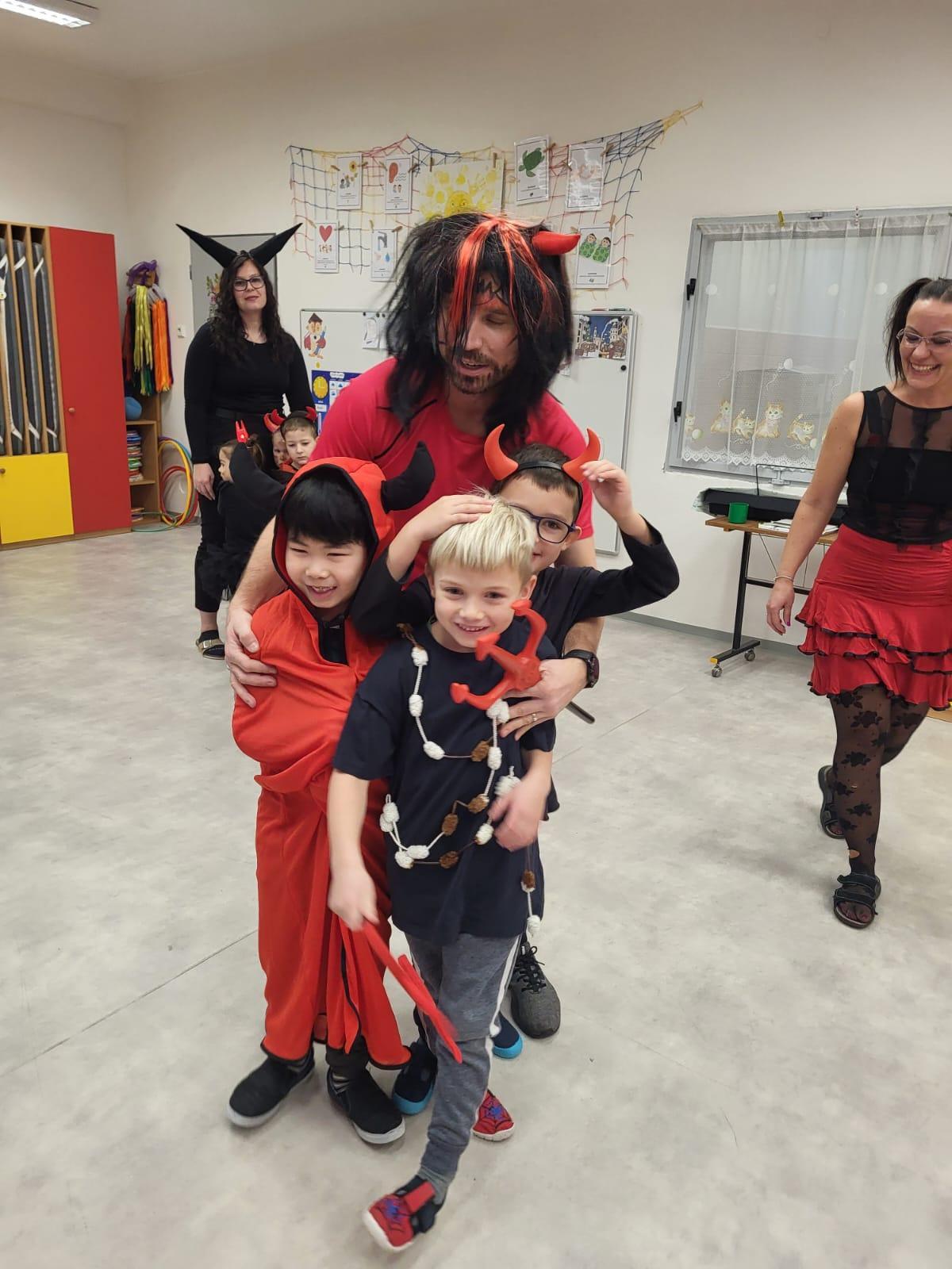 Hned ráno dorazily do školky děti v nádherných kostýmech čertíků, andělů i malých Mikulášů. Fantazii se meze nekladly – nechyběly rohy, ocásky, třpytivá křídla ani veselé masky. Sváteční atmosféru doplnily i naše paní učitelky a asistentky, které se také převlékly do kostýmů a spolu s dětmi vytvořily hravou a veselou pekelně-andělskou partu.